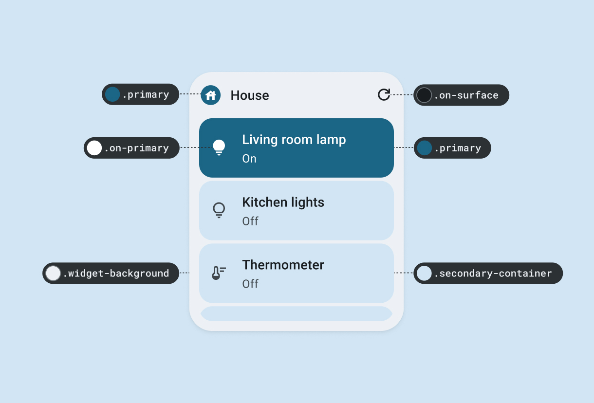 Kullanıcının ana ekranına daha iyi uyması için widget'ınızın sistem cihaz temalarına uyum sağlamasına izin verin. Böylece widget, açık ve koyu temalar ve kontrast ayarları gibi özellikleri kullanabilir.