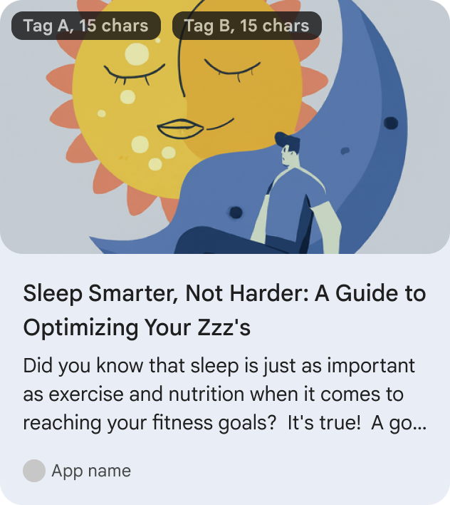Recommendation clusters show personalized health and fitness suggestions from an individual developer partner. These recommendations can be personalized to the user or generalized (for example, trending fitness & health). Use these to surface articles or people related to health and fitness.