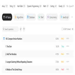 | 0001 | Two Sum | Easy | Top_100_Liked_Questions, Top_Interview_Questions, Array, Hash_Table, Data_Structure_I_Day_2_Array, Level_1_Day_13_Hashmap, Udemy_Arrays, Top_Interview_150_Hashmap, Big_O_Time_O(n)_Space_O(n), AI_can_be_used_to_solve_the_task | 1 | 89.70 |