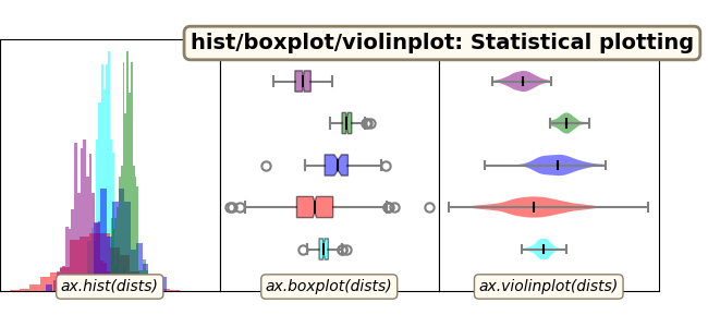 # We've briefly mentioned `ax.plot(x, y)` and `ax.scatter(x, y)` to draw lines and points, respectively. We'll cover some of their options (markers, colors, linestyles, etc) in the next section. Let's move on to a couple of other common plot types.
