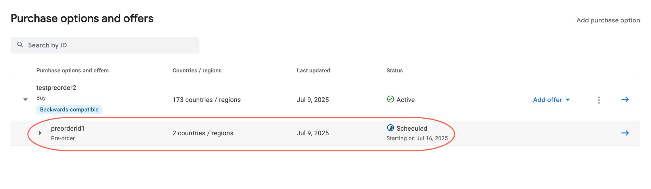 - If you have activated a purchase option without any pre-order offer(s), you can’t create a pre-order offer for that purchase option. You must create a new one-time product followed by a purchase option, and then add pre-order offer(s) to the new purchase option.