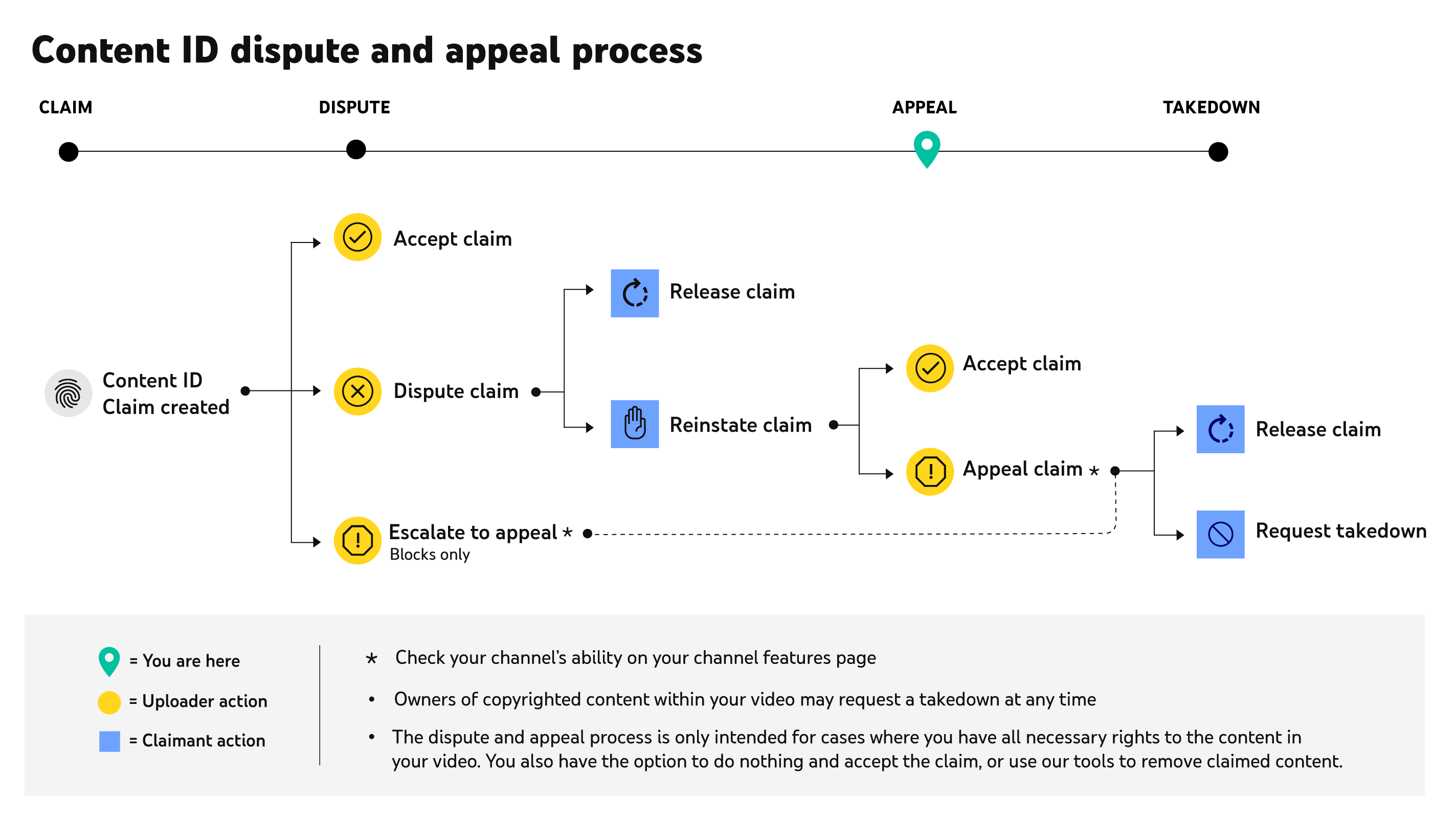 If you disputed a Content ID claim, but the claim was reinstated, you may be eligible to appeal this decision. If a Content ID claim blocked your video, you may be able to skip the initial dispute step and start the process with an appeal.