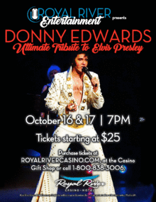 ELVIS IS IN THE BUILDING for two nights only! Royal River Casino Hotel is proud to present Donny Edwards in an ULTIMATE Tribute to the King on November 22nd and 23rd at 7pm. This show is sure to thrill any fan of Elvis Presley as Donny Edwards takes you on a journey of the Kings greatest hits through the years.