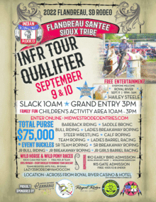 INFR Tour Qualifier Rodeo sponsored by the Flandreau Santee Sioux. September 9 & 10 across from Royal River Casino & Hotel. Featuring Wild Horse & Pony Races; Bareback & Bull Riding; Calf & Team Roping; Steer Wrestling; Saddle Bronco Busting; Barrel Racing; and many more activities. Family Fun Children Area. Kids 10 and under are free; Event Prizes and Belt Buckle to be awarded with a total purse of $75,000. Free entertainment Friday Night 9pm-1am Hailey Steele.