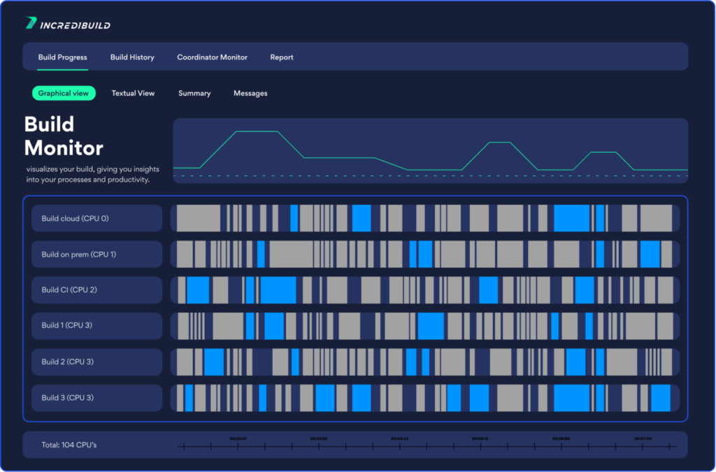 The Build Monitor is the heart of Incredibuild’s observability suite, offering detailed views of a build process in real time, or after it completes, giving you clearer insights and optimization options.